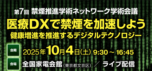- 2025/10/7 >>第7回禁煙推進学術ネットワーク学術会議は終了しました。皆様ありがとうございました。